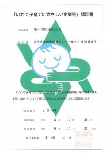 「いわて子育てにやさしい企業等」の認証を10月26日(火)付で取得することが出来ました。
