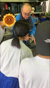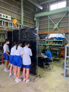 ※溶接時は強力な光が発生するため、遮光シートで直接光を見ないよう安全に配慮して見学を行っています。