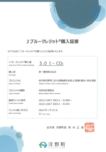 この度、岩手県洋野町が発行する「Jブルークレジット」を5t(t-CO2)購入し、